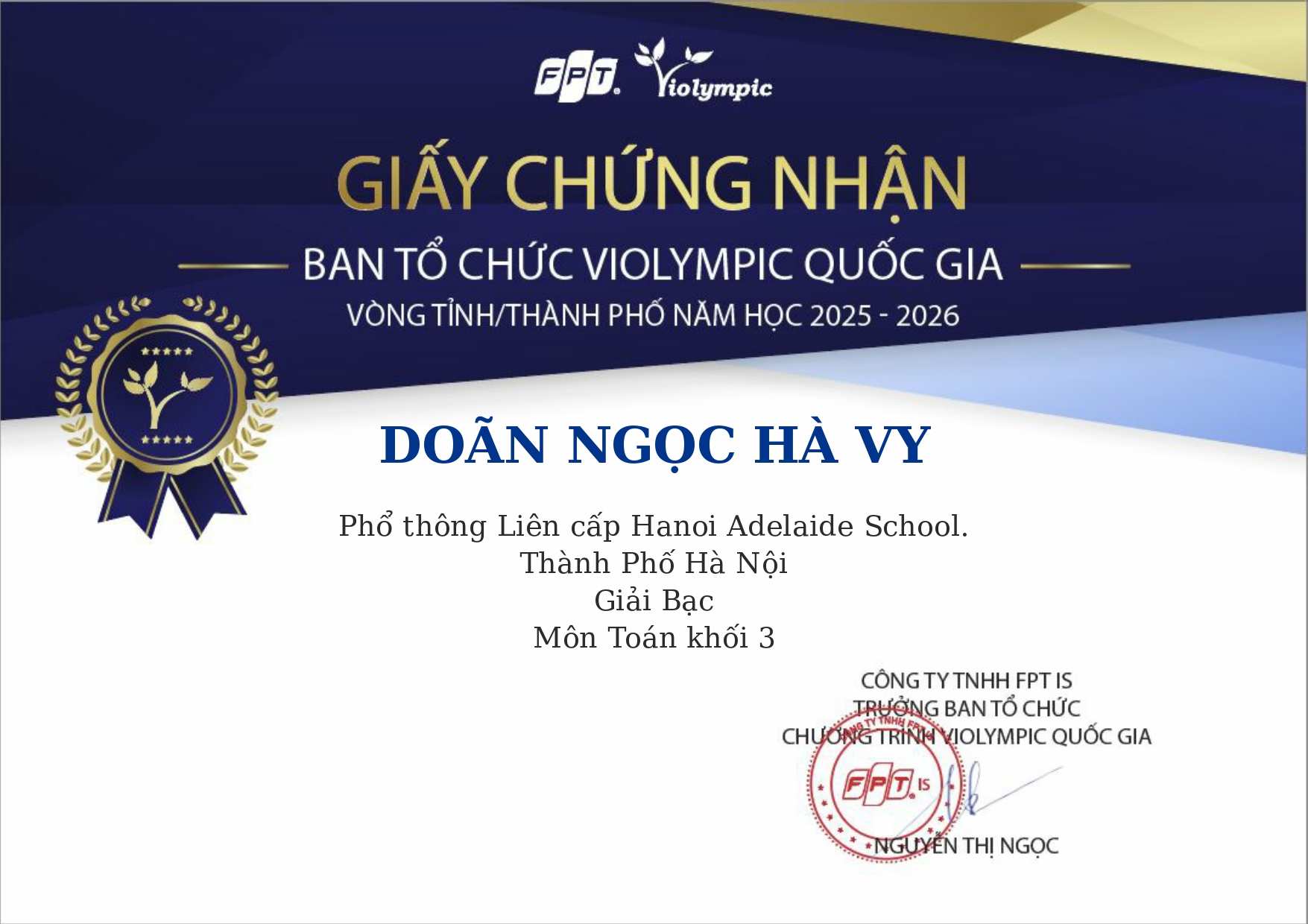 At this year’s City-Level Competition, Doãn Ngọc Hà Vy (Class 3H) achieved outstanding results: