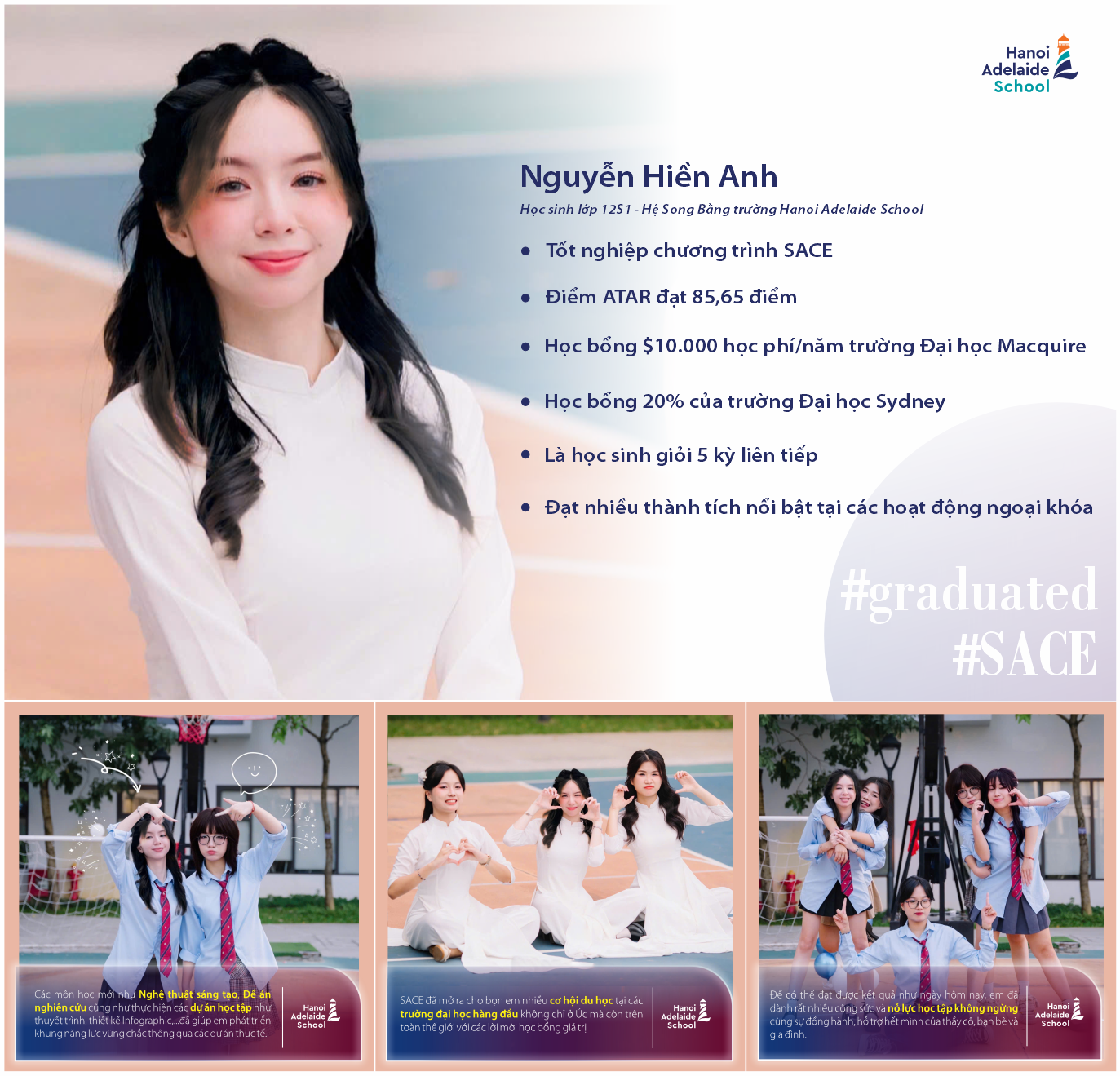 Gặp lại Nguyễn Hiền Anh (lớp 12S1) vào một ngày nắng khi cô học trò nhỏ ngày nào đã chuẩn bị sẵn sàng hành trang cho một chặng đường mới đầy thú vị sắp tới tại đất nước Úc xinh đẹp. Xuất sắc đạt 85,65 điểm ATAR và dành được học bổng tại Đại học Sydney, hãy cùng lắng nghe những chia sẻ của Hiền Anh trong bài phỏng vấn ngắn dưới đây về hành trình học tập đầy ắp kỷ niệm tại Hanoi Adelaide School.